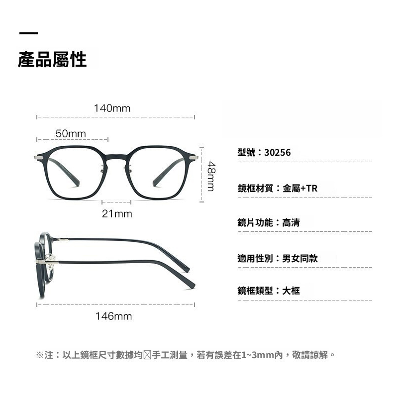 ‧ 以上鏡框尺寸均為手工測量,可能存在1-3mm誤差,請以實物為準!!