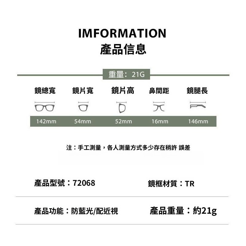 ‧ 以上鏡框尺寸均為手工測量,可能存在1-3mm誤差,請以實物為準!!